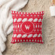 Almofada de Natal de chef vermelha e branca divertida com um padrão de suéter feio de chapéus de chef e flocos de neve. Há um círculo de monograma na frente para adicionar seu próprio círculo inicial