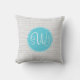 Este travesseiro tem um teste padrão cinzento da viga no fundo com um círculo azul e um monograma de três letras no centro.