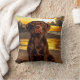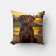 Um Labrador Retriever de chocolate senta-se numa praia arenosa, mirando intensamente na câmera. O pelo do cachorro é um marrom rico, contrastando com as matizes ouros do sol de pôr. O céu está em chamas com vibrantes nuvens de laranja e rosa, refletindo na areia molhada. O oceano levemente volta à costa, criando uma atmosfera tranquila e serena. Presente ideal para amantes de labrador.
