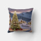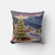 Serene Christmas holiday landscape scene with decorated Christmas tree in the midst of a village in early evening.