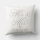 Travesseiro de sotaque quadrado elegante para casais felizes e recém-casados apresenta um roteiro de cinza de pewter Sr. e Sra. design com um texto personalizado que pode ser personalizado com o sobrenome casado. A cor branca de fundo pode ser personalizada para coordenar com as cores de decoração da casa ou do quarto.