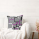 Um design divertido de quadrados retrorinspirados feitos em roxo, preto e branco contra um fundo de cinza em um travesseiro decorativo.