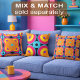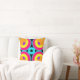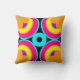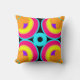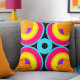 Esta almofada de lançamento desenhada à mão é coberta com motivos florais circulares superdimensionados em laranja, rosa, amarelo e roxo, todos dispostos em torno de um centro turquesa. A simetria geométrica ousada se destaca contra o fundo preto, dando-lhe um estilo retrô vibrante. É perfeito para fazer uma declaração colorida no seu sofá, cama ou cantinho de leitura.