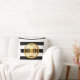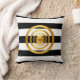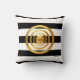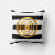 Círculos de ouro elegantes em travesseiro decorativo listrado preto e branco. O design tem um ponto de ouro rodeado por três círculos ouros.