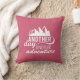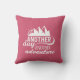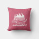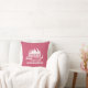Um travesseiro com uma aventura inspiradora/citação viagem que diz: Outro dia outra aventura. Uma imagem com o sol a espreitar por detrás de algumas montanhas. Colocado sobre um fundo cor-de-rosa.