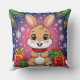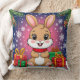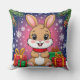 Coelho de desenho animado adorável sentado entre neve, enfeites e presentes, evocando alegria natalina com cores vibrantes e um cenário invernal festivo. Perfeito para cartões de saudação sazonais e designs de feriados.