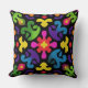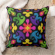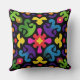 This colorful folk abstract throw pillow showcases a bold ornamental pattern inspired by tribal motifs, retro folk art, and psychedelic design. The composition features dynamic organic shapes arranged in a balanced, symmetrical layout, set against a deep black background that makes every color pop.