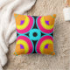 This hand‑drawn throw pillow is covered with oversized circular flower motifs in orange, pink, yellow, and purple, all arranged around a turquoise center. The bold geometric symmetry stands out against the black background, giving it a vibrant retro style. It’s perfect for making a colorful statement on your sofa, bed, or reading nook.