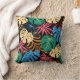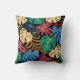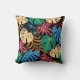 Colorful throw pillow with a tropical leaf pattern. The design features green, blue, pink, and yellow leaves on a dark background. Both front and back views are shown, conveying a vibrant, lively tone.