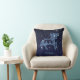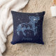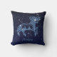 Travesseiro decorativo com o símbolo do zodíaco de Aries em azul-prata suave, sobreposto com as estrelas da constelação, contra um fundo do céu estrelado formando de azul-da-meia-noite profundo a preto.