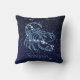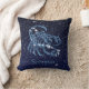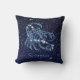 Travesseiro decorativo com o símbolo do zodíaco de Scorpio em azul-prata suave, sobreposto com as estrelas da constelação, contra um fundo do céu estrelado formando de azul-da-meia-noite profundo a preto.