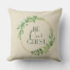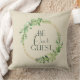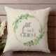 Almofada com fundo creme suave, elegante grinalda verde e dourada com as palavras "Seja nosso convidado" na frente, parte de trás combinando. Veja todos os nossos artigos decorativos em nossa loja Zazzle!