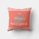 Na moda e estilo moderno de tendências estilo vivo cor de coral família praia monograma travesseiro decorativo de decoração com script, monograma de cor aqua com tipografia branca e negrito. Use o recurso "personalizar este modelo" para inserir o nome da família, a data inicial e a data estabelecida.