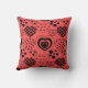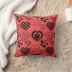 Este travesseiro decorativo tem um design de repetir corações com diferentes dentro gráficos em um campo vermelho.