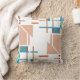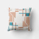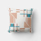 Em destaque está um abstrato, design geométrico em formas e linhas de laranja claro de coral-claro com azul-aqua e ferrugem e elementos esticados, dispostos em um padrão perpendicular, tudo sobre fundo branco, que projeta um olhar contemporâneo no espírito do estilo Moderno do século Médio. Este é um olhar limpo e minimalista nas linhas simples e cores contrastantes, projetando uma qualidade colorida, polida e na moda para a área viva, quarto, espaço de trabalho, terraço ou decor de pátio. Isto também oferece um sentimento de calor, uma ambição relaxada e pacífica para o seu espaço pessoal, um lugar para recuar e contemplar enquanto estiver longe do movimentado mundo do dia a dia. Há muito potencial decorativo nesta peça de sotaque, que se ajustado com muitos estilos, de retrô/safra a rancho rústico a loft urbano moderno ou alta.