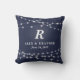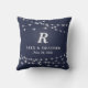 Seus noivos favoritos amarão este travesseiro customizável que caracteriza seu dia do casamento ou aniversário! As cordas das luzes brancas cercam um monograma, os nomes do casal e a data do casamento ou a outra ocasião especial. Você pode mudar a cor do fundo do marinho clicando o botão da personalização. Faz um presente bonito, moderno, personalizado para newlyweds.