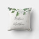 Esta almofada de lançamento floral personalizada elegante para recém-casados apresenta uma borda de folhagem pintada à mão com flores de magnólia brancas. Personalize com os nomes da noiva e do noivo para um presente único. Criado por Susan Coffey.