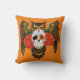 Uma coruja marrom excelente com um dia de crânio de açúcar morto e rosas vermelhas num pano de fundo de laranja.