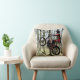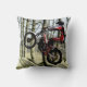 Um travesseiro decorativo ou um coxim quadrado com uma arte digital do efeito do poster de um cavaleiro das experimentações da motocicleta na ação do meio do ar, saltando sobre uma rocha em uma máquina moderna. O design está em branco e preto vermelhos, com um fundo de rochas verdes pálido e árvores e céu azul pálido. Feito de um ©ruralfrance da foto