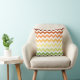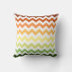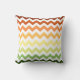 Este travesseiro decorativo moderno apresenta um padrão de cóvron de tendência em uma paleta colorida automática com tons verdes, amarelos e laranja.