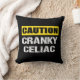 Travesseiro incrível com um sinal de aviso lendo CAUTION CRANKY CELIAC. Ideia de presente de excelente para qualquer pessoa com doença celíaca.