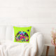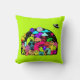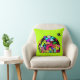Uma almofada com um desenho divertido usando um tema cósmico. Um agrupamento de criaturas espaciais alienígenas. Definido em um design de espaço exterior. Você pode ver uma lua, planetas, espaçonaves a grande velocidade, estrelas e uma nave alienígena pousando. As cores incluem tanto neon brilhante quanto pastéis retrô sutis. Definido em um fundo verde lima emocionante.