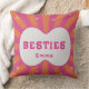 Celebrate an unbreakable bond with this vibrant, retro-inspired personalized pillow. Featuring a bold purple and orange sunburst pattern accented with whimsical stars, the center showcases a unique "cloud-shaped" frame. The word "BESTIES" is displayed in a stylized, vintage-cut font, with space below to add a custom name (as shown with "Emma"). It is a perfect gift for birthdays, long-distance friends, or room decor to celebrate your fPro-Tip for your Listing