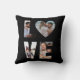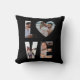 Celebrate your love story with this customizable LOVE photo collage pillow, featuring an elegant black background and space for four personal photos. Each letter in the word "LOVE" is filled with your own images— with the “O” in the shape of a heart for a sweet and romantic touch.