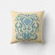 Damask robins ovo azul-velho travesseiro cremoso do mundo, projetado por Kristie Hubler, tem um antigo estilo damask design, padrão repetido na frente, solteiro na parte traseira, com um aqua, um motif gráfico azul-lacrimejante e um fundo dourado amarelo-cremoso.