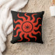 Este travesseiro decorativo apresenta um desenho abstrato e selvagem de um sol vermelho dançante sobre um fundo preto puro. Os raios estilizados parecem dançar ao redor do centro negro. A design é repetida atrás.