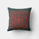 Almofada com ilustração gráfica de ornamento vermelho em fundo verde escuro.