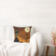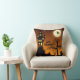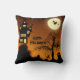 Uma casa assustadora assombrada no topo de uma colina com um túmulo contra um céu laranja escuro. Há uma lua de cheio com uma bruxa malvada voando através dela. Muito divertido e assustador design para seu travesseiro decorativo decorativo de Halloween.