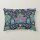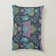 Este travesseiro decorativo tem flores em tons de roxo, azul e verde-oliva cercados por frondes roxas e folhas de corno roxo mudas sobre fundo azul escuro.