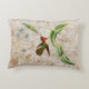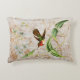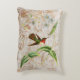 ) O colibri verde e marrom de A com uma garganta vermelha voa perto de uma planta tropical do tweedia com luz - flores azuis, em um fundo esbranquiçado do grunge do vintage com redemoinhos do ouro e as silhuetas florais. A ilustração do colibri é espelhada - enfrentando o sentido oposto - na parte traseira. Harmonização circularmente e travesseiros decorativos quadrados igualmente disponíveis.