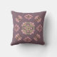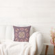 Almofada com ilustração gráfica de ornamento rosa pastel e verde em fundo escuro.