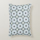 A decorative pillow featuring a symmetrical geometric pattern with blue, white, and brown hues shown from the front and back on a gray background.