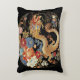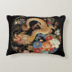 Este travesseiro decorativo apresenta dragões estilo asiático rodeados por flores sobre fundo preto. O design foi criado com a ajuda da IA.