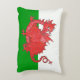 Um Travesseiro de Destaque ou Cushion, com um dragão vermelho giro em fundo verde e branco, semelhante à bandeira nacional galesa; de uma ilustração caprichosa pintada à mão por Judy Adamson.
