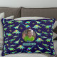 Foto personalizada de meninos e nome dinossauro verde e Travesseiro azul marinho para Crianças - Dinossauro Jurássico Preso Para a criança que ama dinossauros e desfruta de um desafio de ortografia educacional, este padrão de dinossauro colorido personalizado marinho travesseiro azul apresenta dinossauros coloridos e psíquicos divertidos. Esse padrão divertido e vibrante inclui todos os favoritos pré-históricos dos períodos Jurássico e Cretáceo: Tyrannosaurus Rex (T-Rex), Velociraptor, Brachiosaurus, brontosaurus, stegossauro, Tricerátops e o dinossauro voador Pterodactyl. Adicione o nome de uma criança e uma foto acalentada para personalizar esta design única de dino e transformar qualquer quarto num espaço temático Jurássico, um divertido presente de dino inspirado na paleontologia para mentes jovens curiosas e apaixonadas por dinossauros. Arte original de Catherine Sweetman.