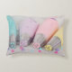 Travesseiro com uma fotografia bonito de cor pastel. Apresentando artigos decorativos em azul pastel, rosa, pêssego e amarelo. Colocada sobre uma mesa de madeira com pequenas miçangas coloridas.