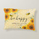 Uma almofada como um presente de casamento ou lembrança. Um fundo dourado com um padrão de favo de mel de abelha e abelhões felizes sorrindo. Decorado com girassóis amarelos e laranjas, flores e folhagens. Personalize e os nomes do casal. letras pretas. O texto: bee happy escrito com um estilo de letra manuscrita moderna, grande e com floreios.