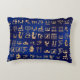 Este travesseiro de sotaque legal e único apresenta um tema antigo de arte egípcia. Um padrão de hieroglifos dourados é impresso em um fundo texturizado a azul. Coloca-se uma inicial de monograma no centro de uma armação de ouro.