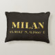 Design de travesseiro de sotaque Lux apresenta a cidade de Milão, as coordenadas de latitude e longitude do mapa italiano em fontes douradas sobre fundo preto.