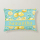 Travesseiro de destaque com um padrão de limão amarelo giro em azul claro e espaço para adicionar um nome em ambos os lados