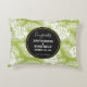 Um travesseiro de casamento com um padrão repetitivo de folhas grandes de palma num fundo verde-oliva. Trendy moderno e tropical. Um círculo preto com uma borda dourada colocada sobre cima com sua dentro de detalhes personalizada.