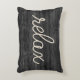 Texto "Relaxe" em design de corda náutica sobre fundo de madeira de cinza escura.