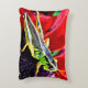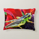 Este travesseiro de sotaque decorativo apresenta um gafanhoto verde, amarelo e preto brilhante pendurado no centro roxo de uma flor com pétalas vermelhas lindas.