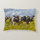 Este travesseiro lombar oferecerá algum suporte necessário às suas costas inferiores após um dia de trabalho na fazenda. Apresenta uma fileira de vacas leiteiras de raça Holstein, a preto e branco, que se encontram atrás de uma cerca de arame farpado com ervas amarelas brilhantes no primeiro plano e um céu azul turbulento acima.