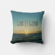 Deus é bom Travesseiros de citação. Citações/mensagens cristãs inspiracionais e motivacionais para travesseiros decorativos. Esta design apresenta um design de praia com o tema da praia (pôr do sol sobre o oceano) com uma tonalidade azul para uma sensação retrorreflectora inspirada, fazendo a citação, "Deus é bom".