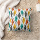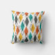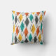 Este travesseiro decorativo tem um moderno século médio de diamantes em laranja, amarelo, turquesa, cinza e esboçado por todo um campo de branco.